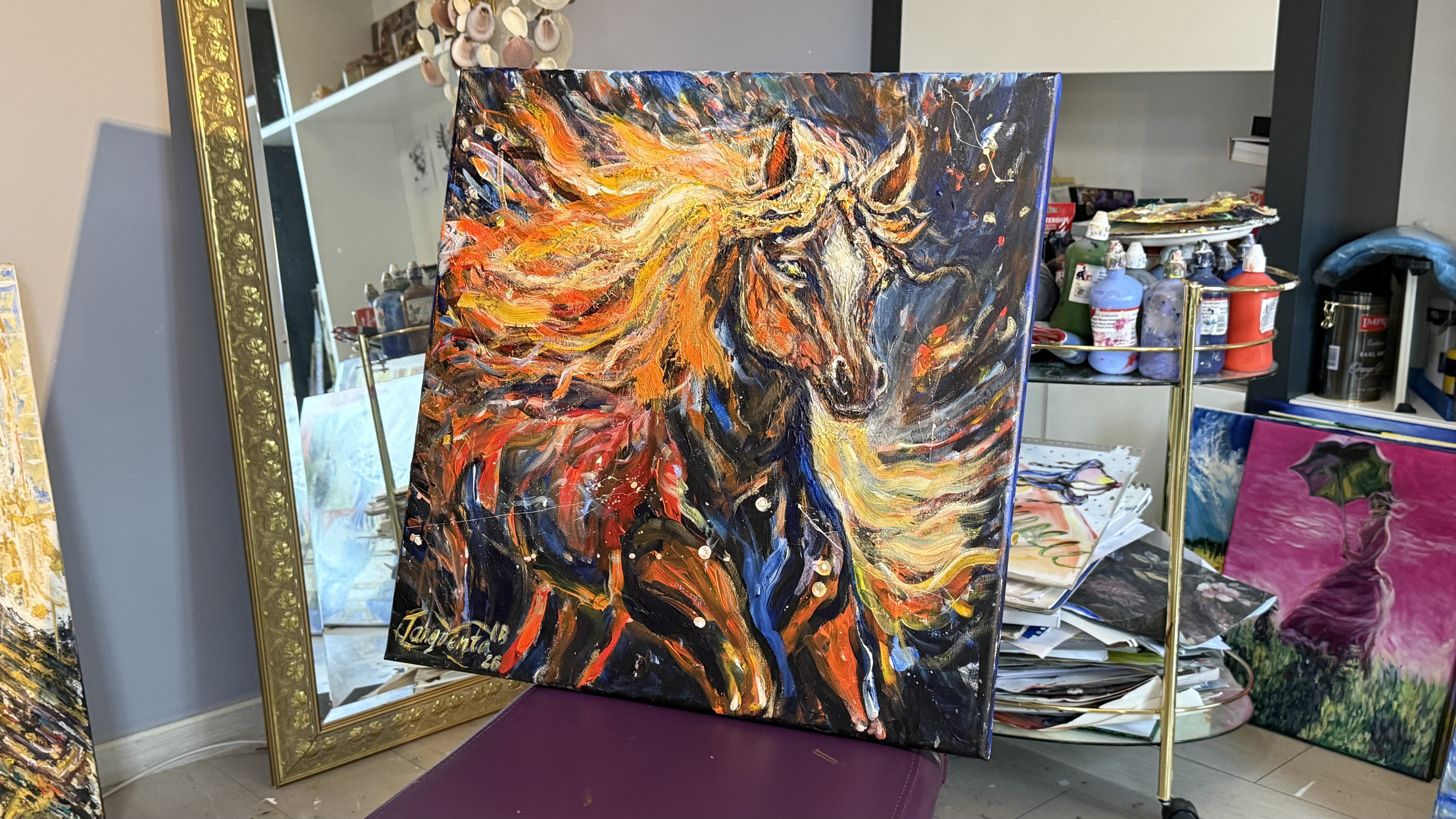 The horse is still young in its power — not yet at full force, but already filled with movement and life. Its body emerges from darkness while the mane bursts into waves of orange, gold, crimson, and electric blue, like flames of energy beginning to spread.