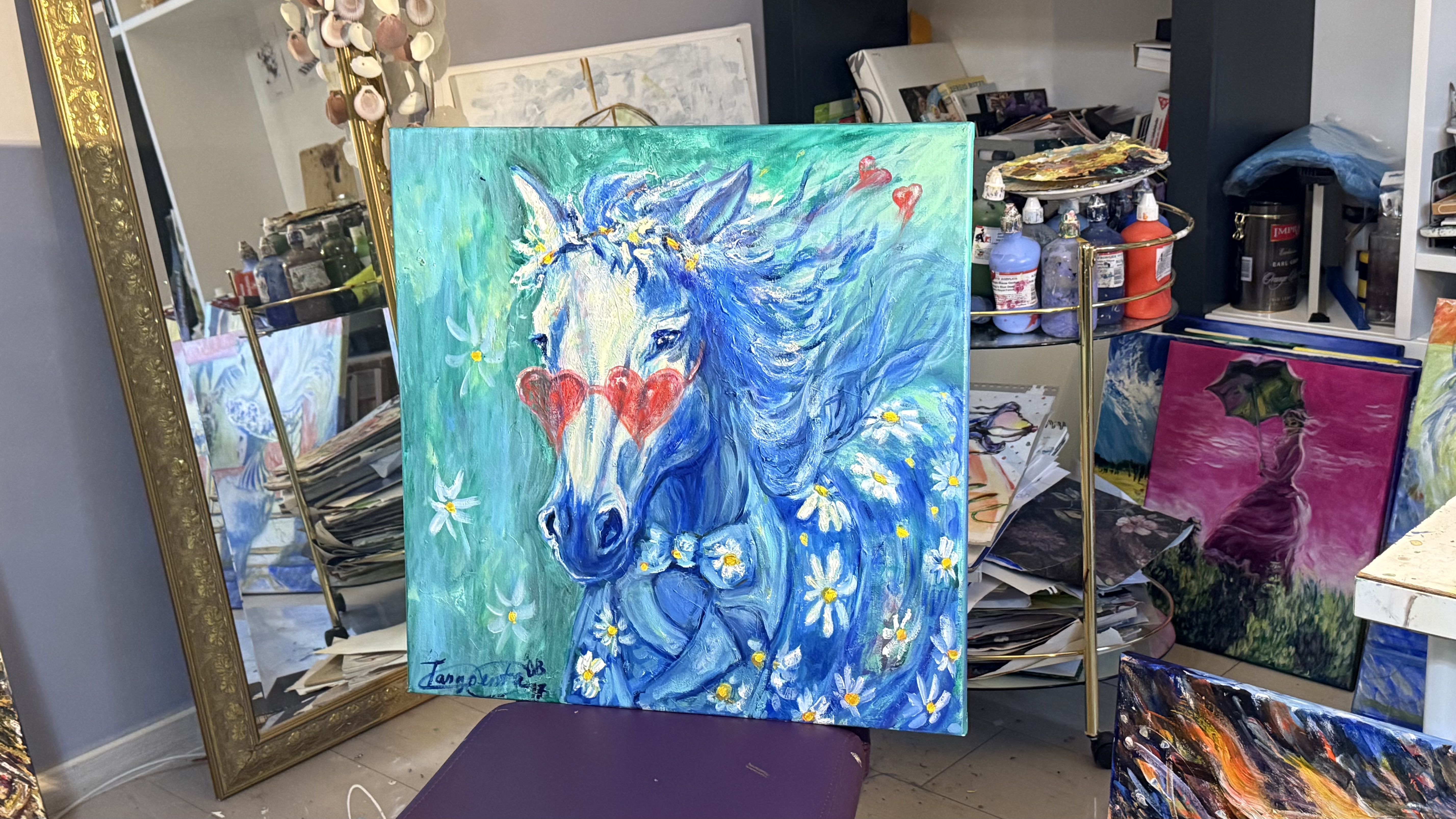“Sturm und Drang” captures a moment where emotion rises like a sudden wind through a field of flowers. The blue horse, both powerful and tender, moves through a swirl of turquoise air and white daisies, embodying the restless energy of feeling that cannot remain still.